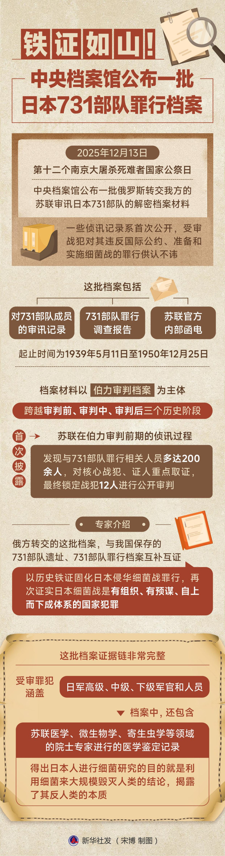 2025年12月13日,第十二个南京大屠杀死难者国家公祭日,中央档案馆公布一批俄罗斯转交我方的苏联审讯日本731部队的解密档案材料。一些侦讯记录系首次公开,受审战犯对其违反国际公约、准备和实施细菌战的罪行供认不讳。